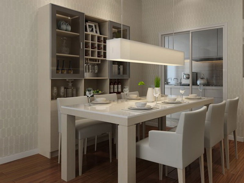 餐厨空间,在简洁的色彩搭配下,显得清爽而明亮。沿墙面放置的大面积酒柜,为餐厅打造了充足的收纳空间,让小小的餐厅一应俱全。而通透的玻璃趟门,隔开了厨房与餐厅两个空间,让两者视如一体,却又有所独立的感觉。