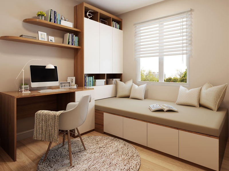一体设计,能依据户型具体尺寸充分镶入三房两厅的空间内,满足住房基本储物、装饰、睡眠等功能,此套设计方案简约、大气、性价比高也遵循客户的预算。