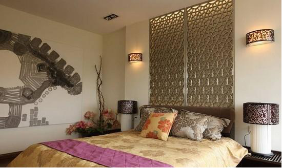 背照天花板和独特的床头背景墙给人一种很有质感的享受,配上绿色的塑料竹子,让人倍感宁静。 心静自然凉,住在这样的卧室中,浮躁的心情很快得到安抚。