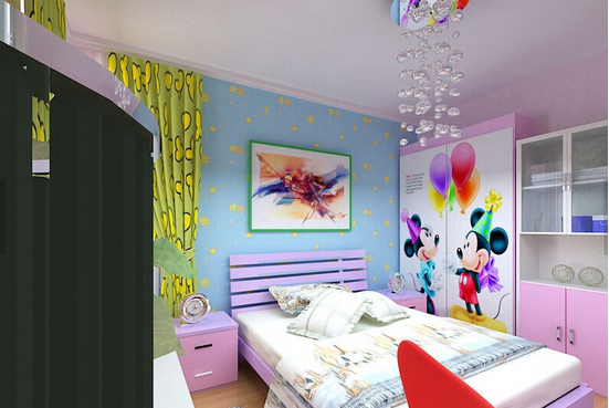 这间卧室采用浅紫色的颜色为主色调,整个房间让人看上去神秘又温馨。米奇老鼠图案的衣柜也很可爱,蓝色星星样式的背景墙仿佛就像星空一样,感兴趣的朋友们可不要错过咯。